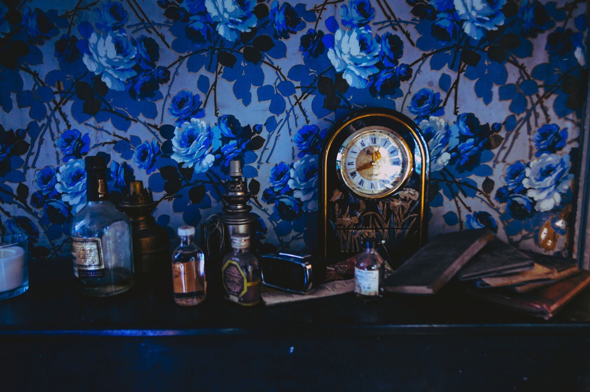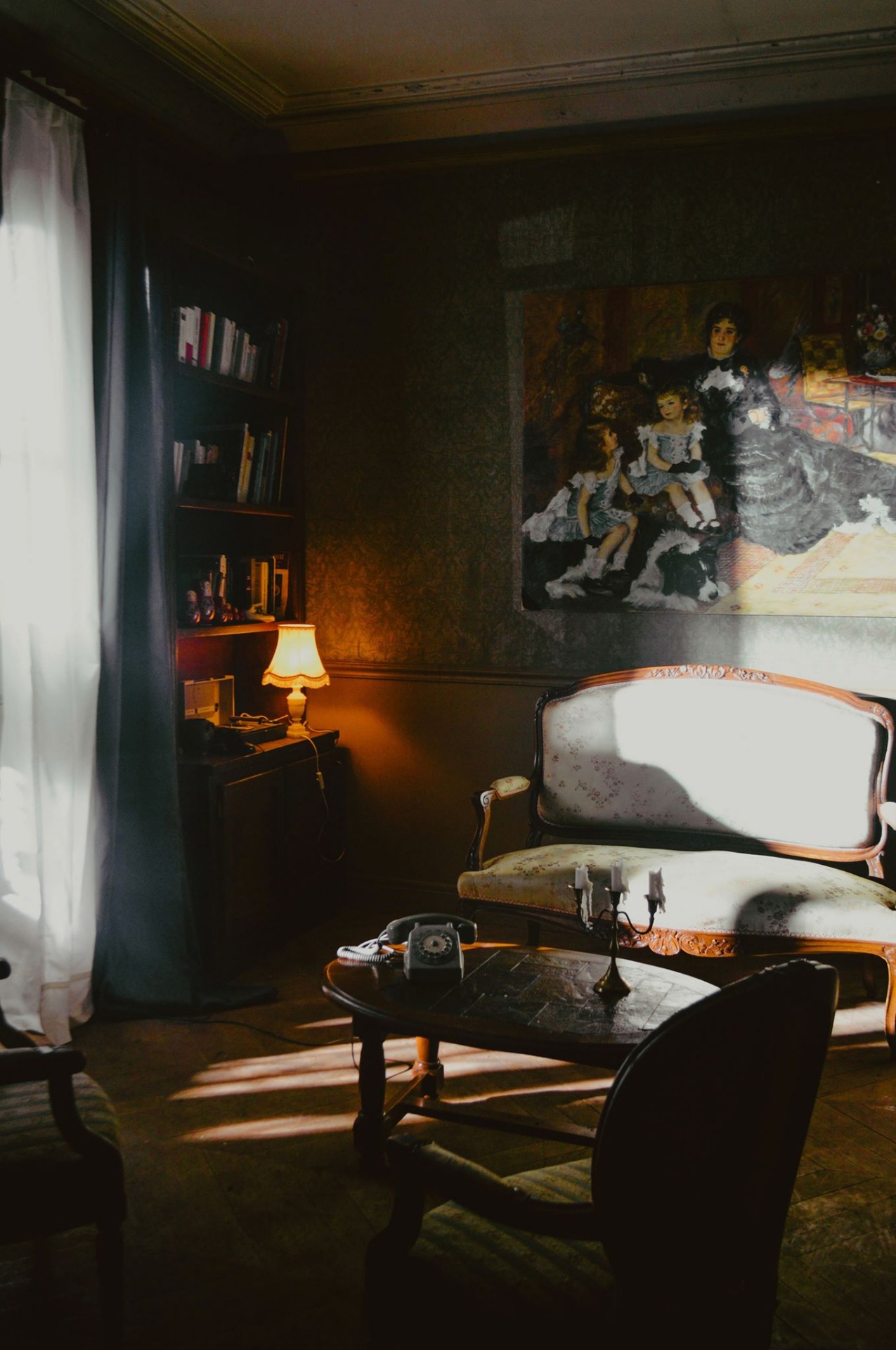 We tried to create in this room something that could allow us (the audience) to target the character immediately as he walks in. In order to do this, we decided to set what is supposed to be the mental space representation of the dark character played by Emmanuel Rehbinder. Clocks, empty bottles and dirty sheets are spread everywhere in this mysterious blue room enlighten by a very bright and rare moon.